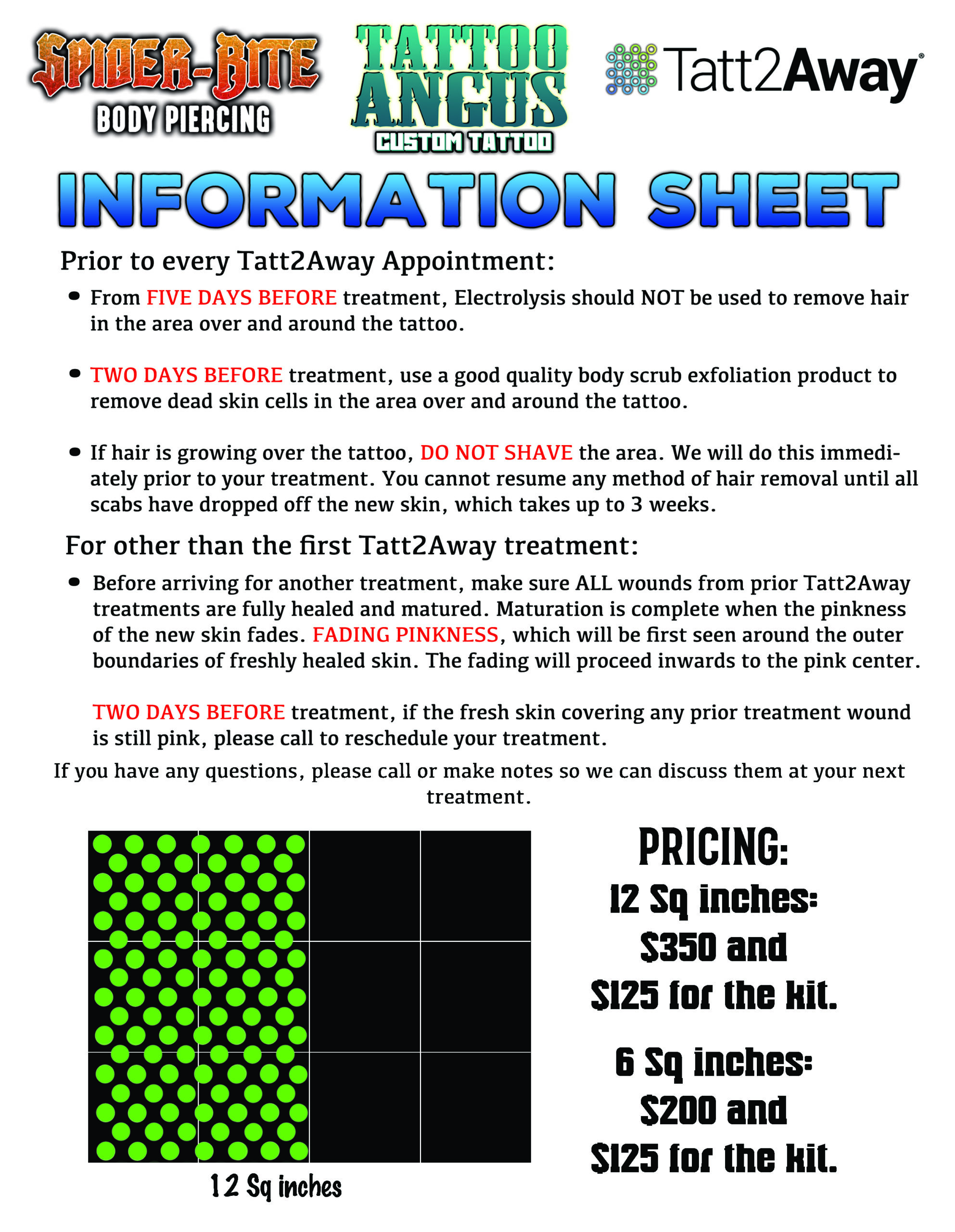 ALL TATT2AWAY appointments require payment in FULL as the deposit. See pricing example below.